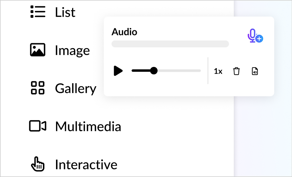 音声作成のシンプル化に加え、カルーセル、タブ、アコーディオンブロックなど22種類のブロックに音声サポートを追加し、コースへの組み込みも容易になりました。ご自身の音声クリップをアップロードする場合でも、AI生成ナレーションを使用する場合でも、学習者の関心を促進する作業がこれまで以上に簡単になりました。